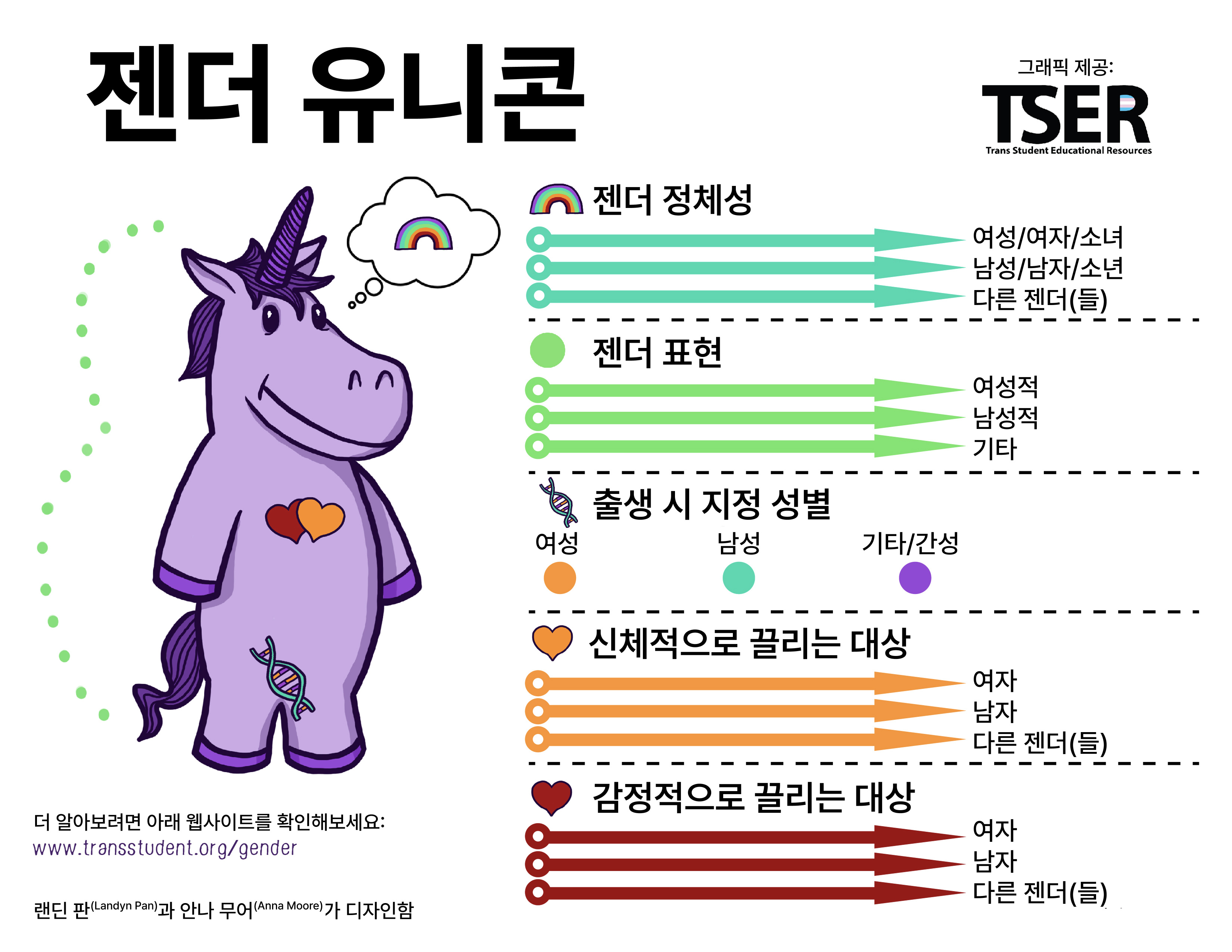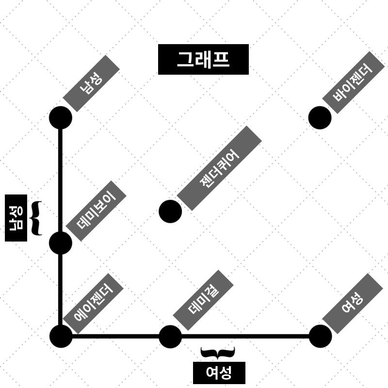 짧게 말해, 어떤 사람들은 매우 남성적이고, 어떤 사람들은 매우 여성적이며, 어떤 사람들은 젠더를 전혀 느끼지 않을수도 있고, 어떤 사람들은 둘 다 느낄수도 있고, 어떤 사람들은 가운데에 던져졌고, 어떤 사람들은 가장자리를 따라 착지했을수도 있습니다. 어떤 사람들은 바람처럼 변화하며 예측 불가능한 방식으로 스펙트럼 전역으로 오갈수도 있습니다. 오직 자신만이 자신의 젠더를 정의할 수 있습니다. 다른 누구도 그것을 강요할 수 없습니다.