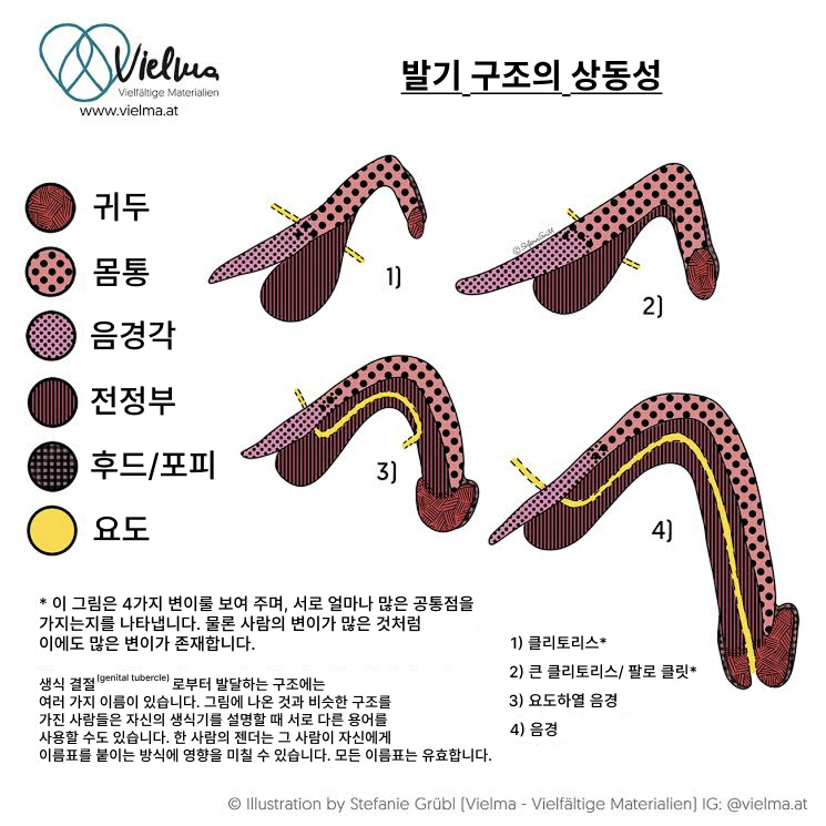 모든 생식기는 동일한 조직으로 구성되어 있으며, 단지 임신 기간 동안 서로 다르게 배열될 뿐입니다. 이러한 조직들의 활동은 대부분 신체를 가동하는 호르몬에 의해 조절됩니다. 피부 분비물, 질감, 예민도, 발기 양상 등은 모두 호르몬의 표현 결과입니다. 즉, 안드로겐을 제거하고 에스트로겐을 투여하면, 실제 형태가 그렇지 않더라도 이 조직들이 외음부(vulva)처럼 작동하기 시작합니다.
