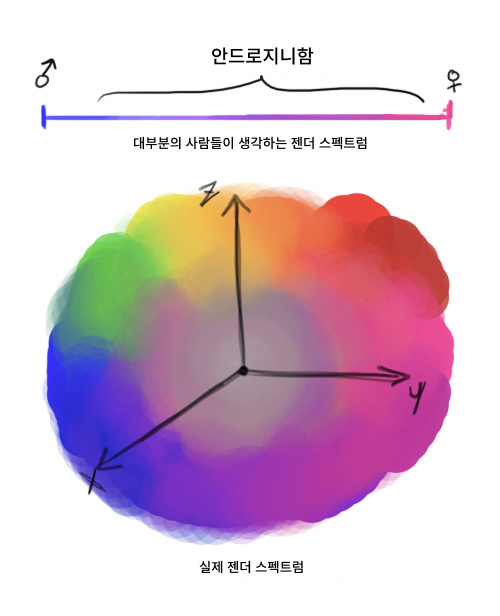 하지만 젠더는 훨씬 더… 난해합니다. 사람들이 젠더 스펙트럼을 설명할려고 했던 여러 다른 방법들이 존재하지만, 그 어떠한 것도 완전히 담아내지 못했습니다. 왜냐하면 스펙트럼 자체가 매우 추상적인 개념이기 때문입니다.